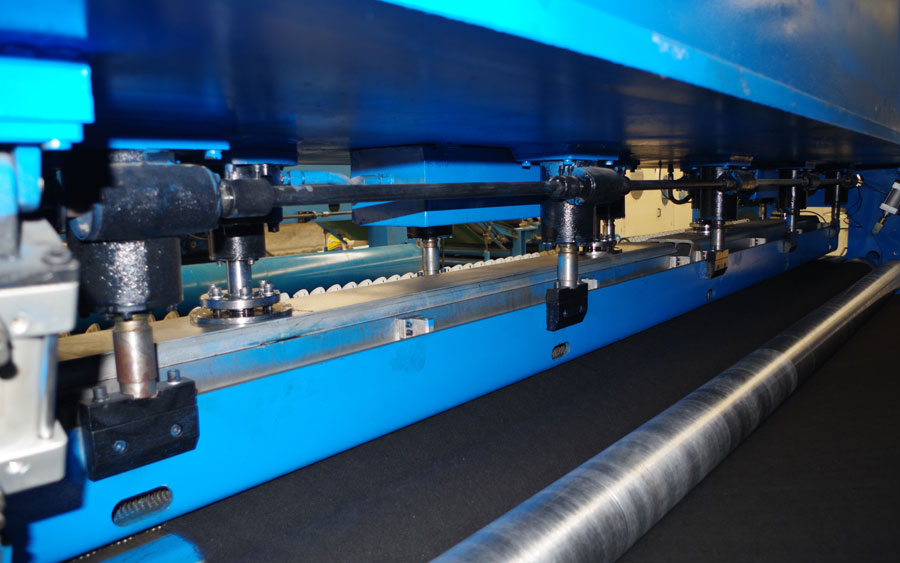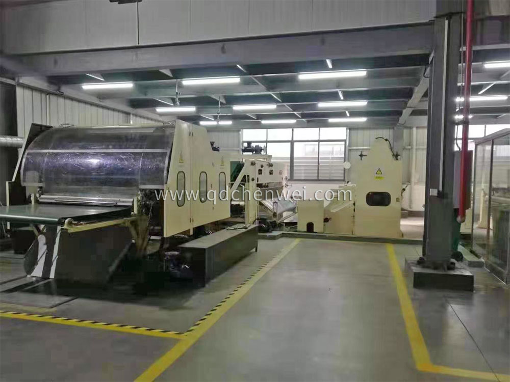 5. CWPW-鋪網(wǎng)機(jī):用于將梳理纖網(wǎng)通過移動小車交叉折疊為所需幅寬和定量的多層纖網(wǎng),以供后道工序使用。鋪網(wǎng)輥采用特殊結(jié)構(gòu),加裝壓網(wǎng)輥和導(dǎo)流板,不飄網(wǎng)不起皺,五只大功率電機(jī)精確控制各部件的運(yùn)動,電動輸出簾高度調(diào)節(jié)裝置