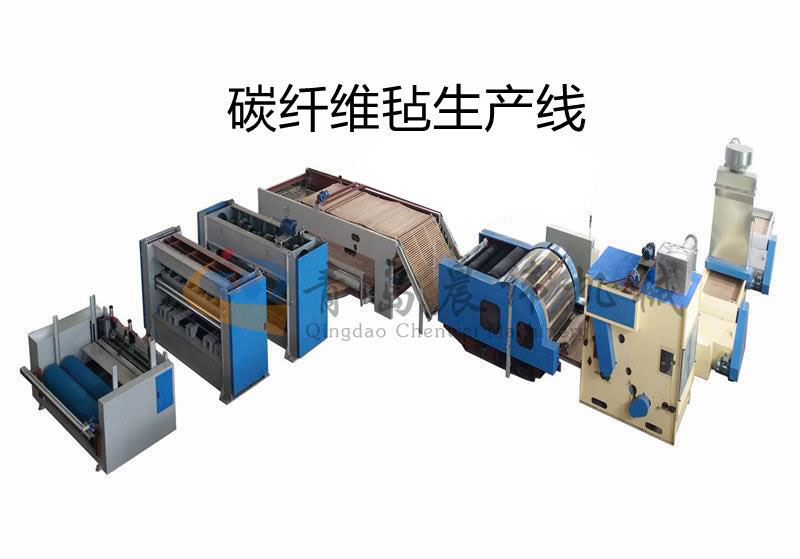 該設(shè)備機(jī)組主要用于碳纖維網(wǎng)胎層的制備。其工作原理是將短切碳纖維,通過均勻給棉、氣流梳理、鋪網(wǎng)、針刺、成卷等操作過程,制備出具有規(guī)定尺寸、克重和均勻度的網(wǎng)胎層。