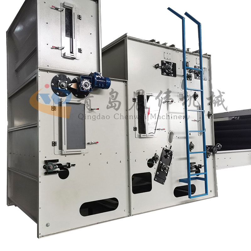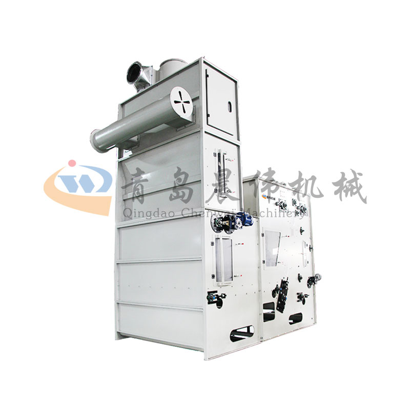 震動(dòng)式給棉機(jī)主要式將經(jīng)過(guò)初步開松的纖維集中收集在棉倉(cāng)中,并且鋪成相對(duì)均勻,等厚,等寬的纖維棉層輸送到梳理機(jī)。